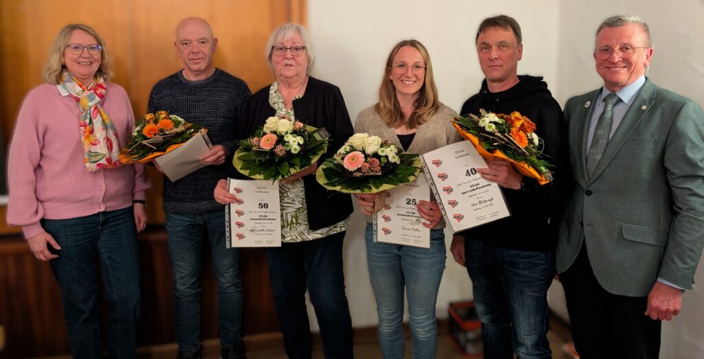 Abschließend wurde Denise Möller für 25 Jahre, Jörn Blotevogel und Bernd Spechtmeyer für 40 Jahre Jahre sowie Roswitha Schaad für 50 Jahre Mitgliedschaft geehrt. Der Vorsitzende bedankte sich bei den Jubilaren für die langjährige Treue und überreichte neben einer Urkunde auch einen Blumenstrauß sowie einen Vereins-Pin.